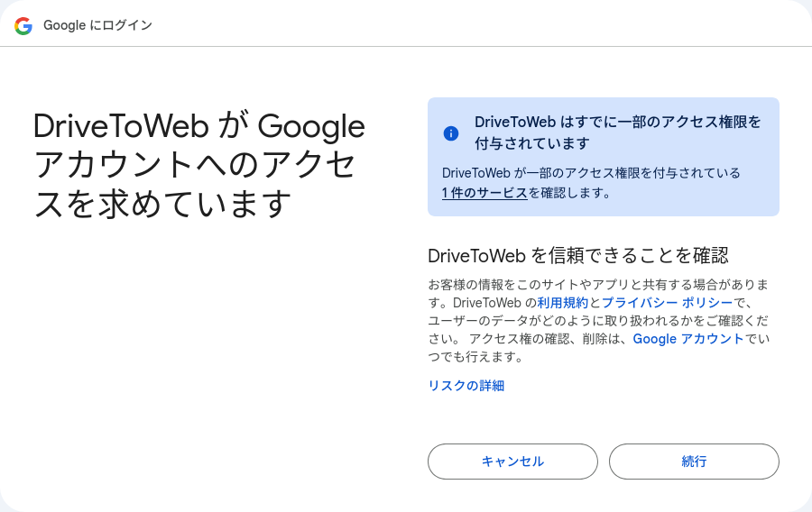 ここではGoogleドライブを使ったので、Drv.twのHost on Google Driveをクリックして、アカウントでログインします。
