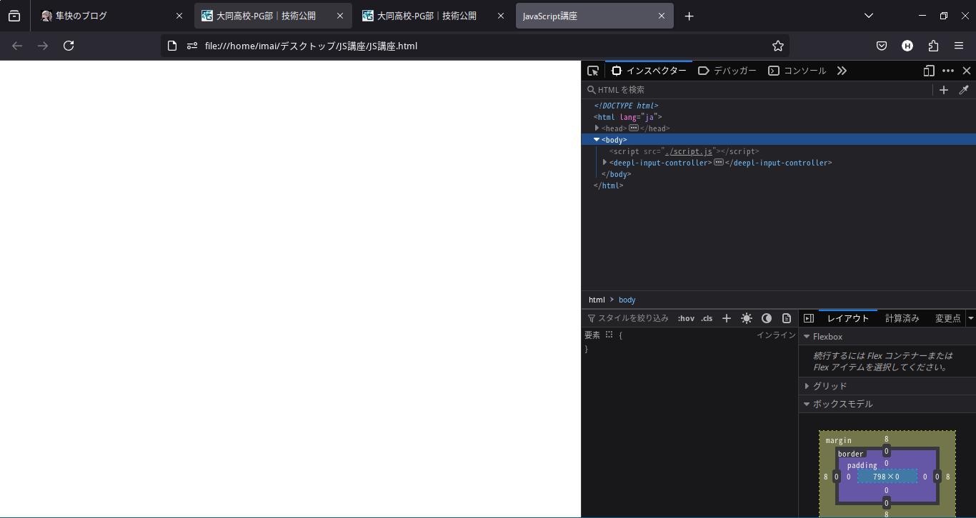 話を戻します。書いたJavaScriptはHTMLに読み込ませているのでブラウザの開発者ツールから実行します。まずは実行したいJavaScriptを読み込ませたHTMLファイルをブラウザで開きます。この状態では上記画像のように、何も起きません。そこでF12を押して開発者ツールを開きます。するとHTMLのソースコードなどが出てきます。