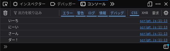 このツールはHTMLのコードの検索やHTML/CSSの装飾の一時的な修正を行う他に、JavaScriptの実行状況の確認やエラーの検出、に役立ちます。はプログラムが正常に実行されてるのかどうか、確認する際などに使われるものです。最初のうちは処理の流れを自分で確認できるようにをプログラムの中に書き込んで流れを確認していきましょう。