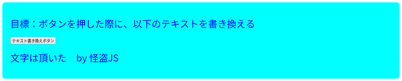 <-- HTMLのコード --> <!DOCTYPE html > <html lang ="ja" > <head > <meta charset ="UTF-8" > <title >JavaScript講座</title > <link rel ="stylesheet" href ="./style.css" > </head > <body > <div class ="soushoku" > <h1 >目標:ボタンを押した際に、以下のテキストを書き換える</h1 > <button id ="bt" >テキスト書き換えボタン</button > <p id ="t0" >ここのテキストを書き換える。</p > </div > </body > <script src ="./script.js" ></script > </html >