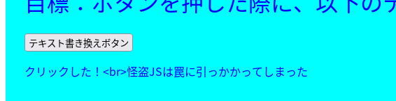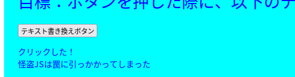 // ここからJavaScript document .getElementById .("bt") addEventListener ("click" ,() => {document .getElementById .("t0") textContent ="クリックした!怪盗JSは罠に引っかかってしまった" ;} );