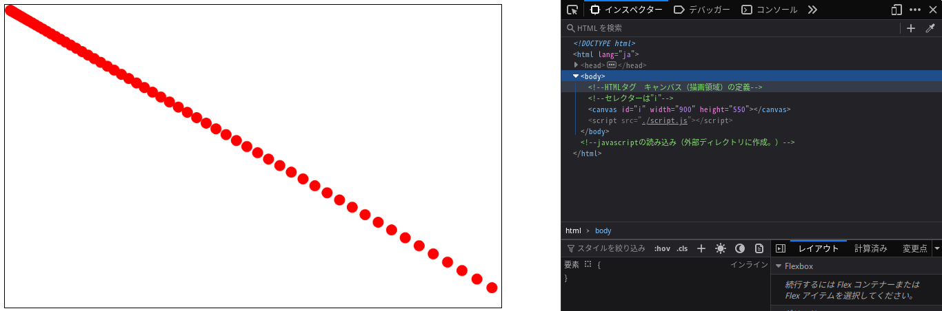 // canvasタグを取得 let c0 =document .getElementById ("canva") ;// canvasに2dで描画する宣言をする。 let c1 =c0 .getContext ("2d") ;// canvasに2dで描画する宣言をする。 let x =10 ;// ボールの描画開始位置 x座標 let y =10 ;// ボールの描画開始位置 y座標 let s =0 ;// ボールの初期状態の速度 const kakudo =Math .PI /6 ;// 傾斜角度の定義(ラジアン) const d =() => {c1 .clearRect ( 0 ,0 ,c0 .width ,c0 .height ) ;// 前に描画した図形を削除して再び描画 // 描画宣言 c1 .beginPath () ;c1 .arc ( x ,y ,10 ,0 ,Math .PI *2 ,true ) ;c1 .fillStyle ="red" ;// 塗りつぶしの色定義(色はカラーネームでも16進数でもOK) c1 .fill () ;// 塗りつぶしの実行 c1 .closePath () ;// 描画終了宣言 s =s +Math .sin ( ;kakudo )// 斜辺に沿って加速 x =x +s *Math .cos ( ;kakudo )// 底辺からx軸を出し、斜辺の速度と足す(加速される) y =y +s *Math .sin ( ;kakudo )// 垂辺からy軸を出し、斜辺の速度と足す(加速される) // キャンバスの描画領域の限界、もしくはx座標が0より小さくなった場合に実行 if ( x >c0 .width ||x <0 ){ s = -s +6 ;// 左右の壁で反射 // +6 はぶつかった際に吸収されるエネルギー値 } } ;setInterval ,( d20 ) ;// 20ミリ秒ごとに関数内のコードを実行