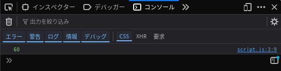 このプログラムを実行します。再起定義した変数「ippei」をコンソールログで読み込んでいいるので、結果は60が表示されるはずです。