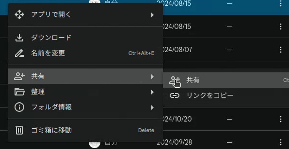 アップロードが完了したら、そのフォルダーを右クリックして、共有を選択します。