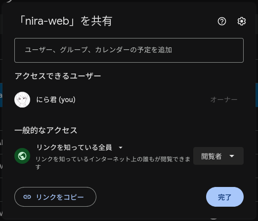 共有はリンクを知っている全員が閲覧できるようにしておきましょう。コメント可や編集者にはしない