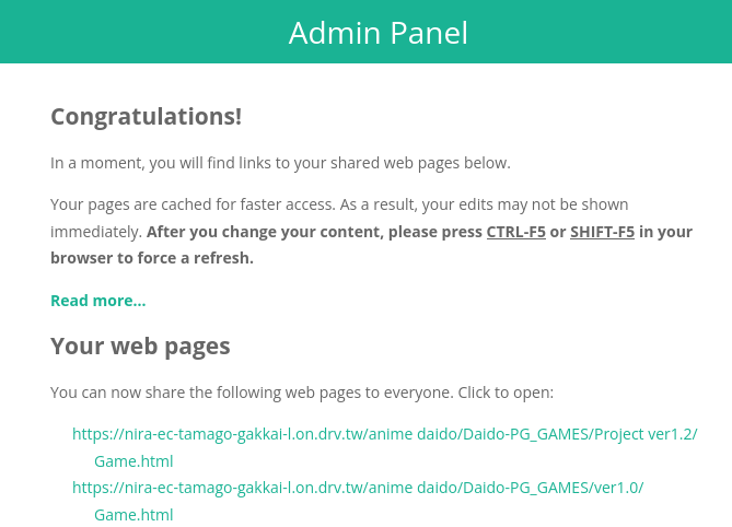 すると管理者のページに飛びます。Your Pagesと書かれているところに、アップロードして、アクセス許可を出したフォルダーの名前が書き出されます。 この中から公開したいサイトのファイルを探し出しましょう。探し出せたらそのリンクを踏みます。するとwebサイトとして公開され、アクセスができるはずです。