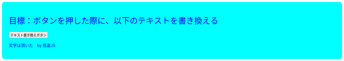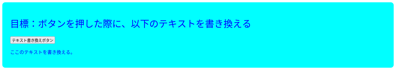 <-- HTMLのコード --> <!DOCTYPE html > <html lang ="ja" > <head > <meta charset ="UTF-8" > <title >JavaScript講座</title > <link rel ="stylesheet" href ="./style.css" > </head > <body > <div class ="soushoku" > <h1 >目標:ボタンを押した際に、以下のテキストを書き換える</h1 > <button id ="bt" >テキスト書き換えボタン</button > <p id ="t0" >ここのテキストを書き換える。</p > </div > </body > <script src ="./script.js" ></script > </html >