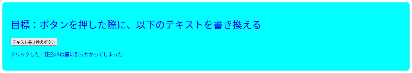 // ここからJavaScript document .getElementById .("bt") addEventListener ("click" ,() => {document .getElementById .("t0") textContent ="クリックした!怪盗JSは罠に引っかかってしまった" ;} );