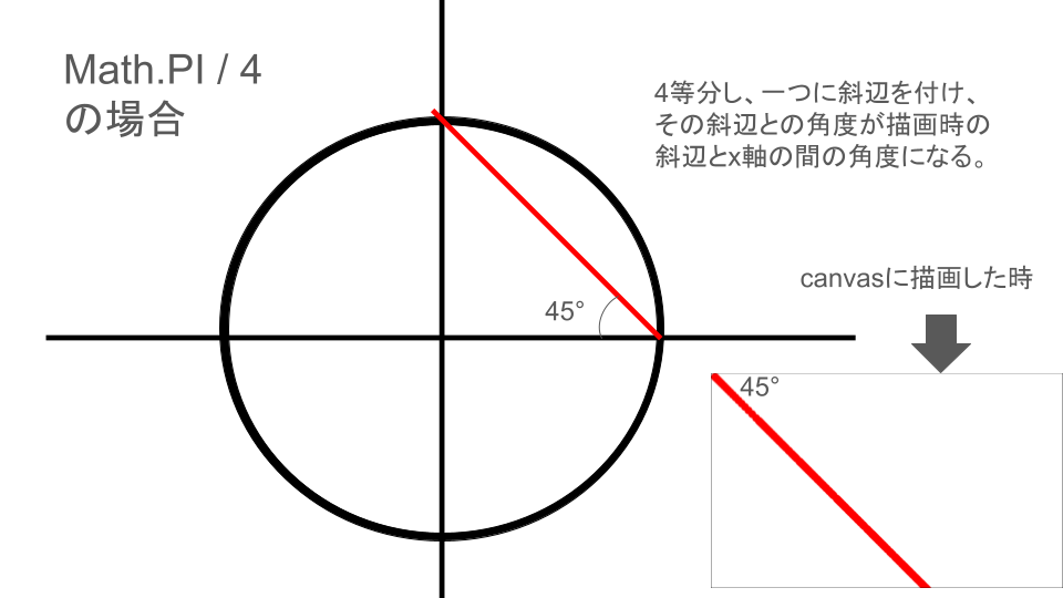 次に斜辺の角度を定義します。ここで使うのがです。は、円の描画の際に用いました今回は円の描画ではなく、角度の表現に使います。