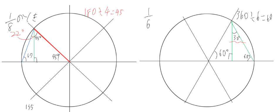 何故数値を使わないのか、それは数学的な角度計算の際、三角比(sin, cos)のライブラリはすべてラジアンを入力として受け付けます。ラジアンは度(degree)とは異なり、角度を円周上の弧の長さとして表現する単位です。度数法を使う場合はラジアンに変換しなければなりません。そのため整数の度数を使わず、円の弧から求めています。