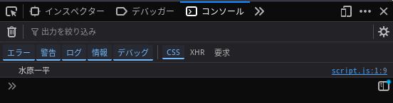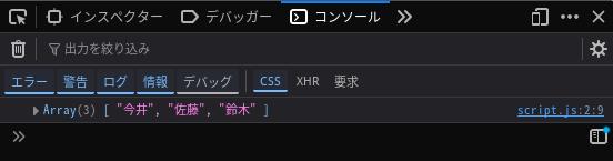 実行してみましょう。let name =[ "今井" ,"佐藤" ,"鈴木" ] ;console .log ( ;name [ 1 ] )