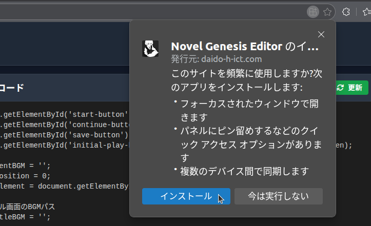 開くと「インストール」や「利用可能なアプリ」というような内容でURLバーに項目が表示されます。